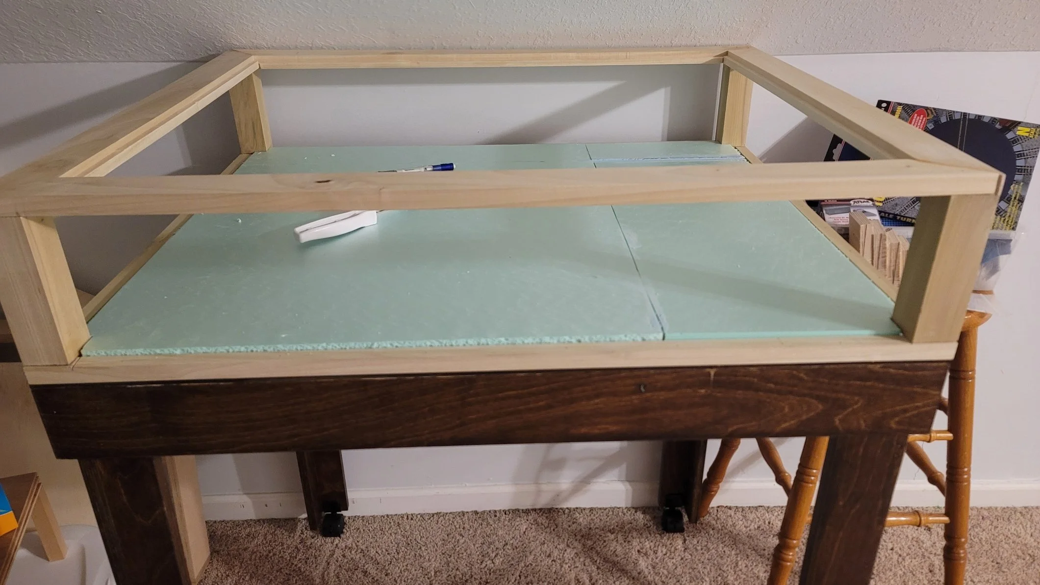 Following staining to match the existing furniture and assembly of the base table, I started working on the surface for each. I knew each table was getting a piece of 1 inch foamboard on top, with space cut out around the rim of each table to allow for the legs supporting what will be the glass tops of the tables and some trim wood around the side to make it look nicer (fun or not, it still needs to look presentable when folks come over to play board games).